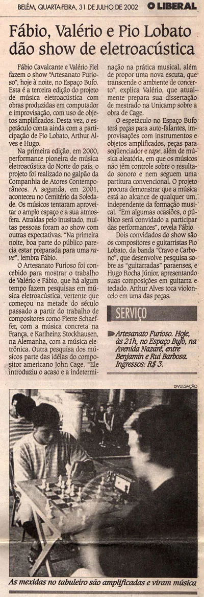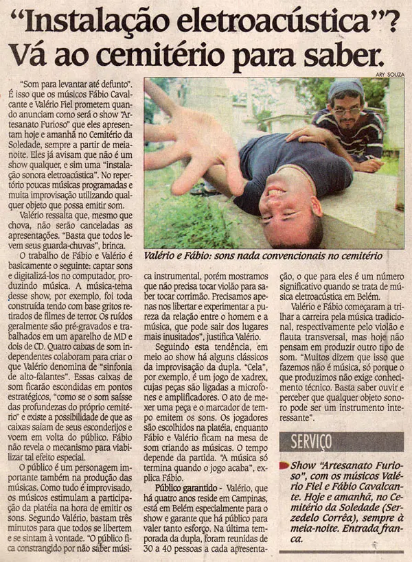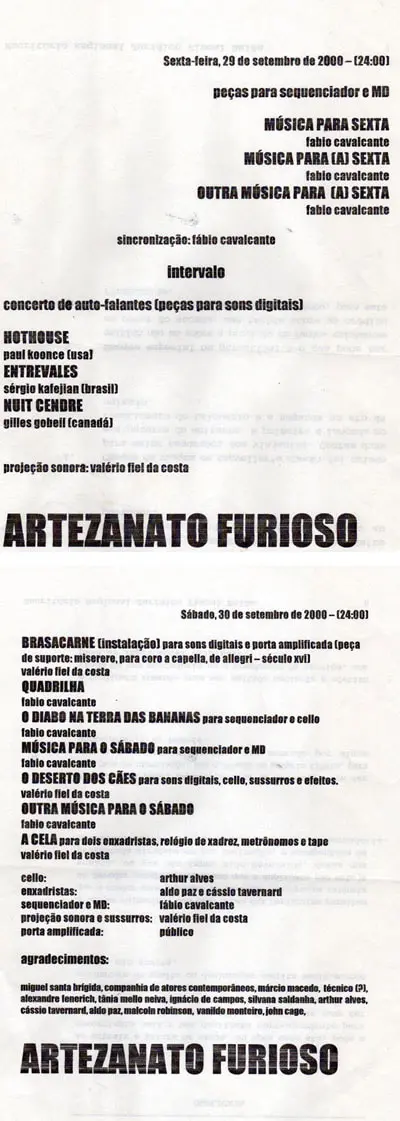 Em 2000, eu e o Valério Fiel da Costa criamos o Artesanato Furioso, um espaço para nossas criações na área de performance eletroacústica e improvisação sobre objetos amplificados.
