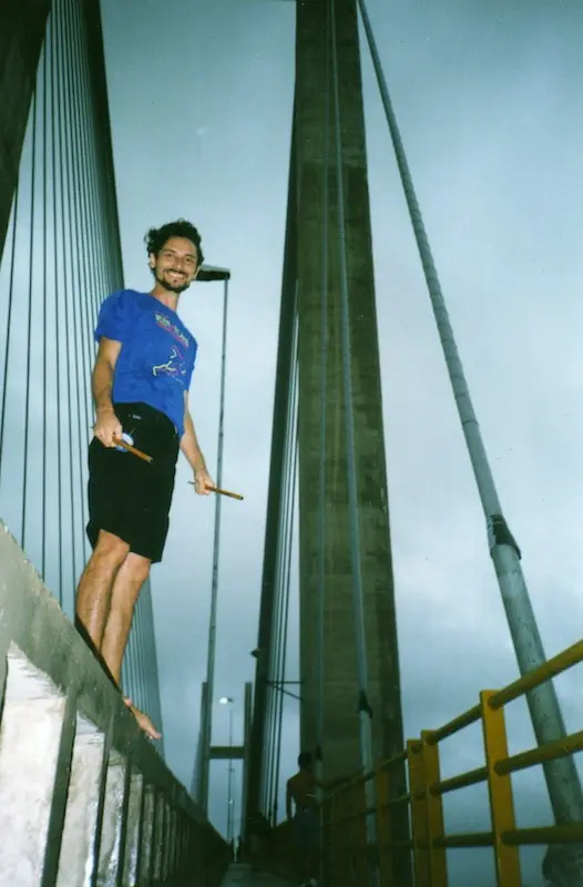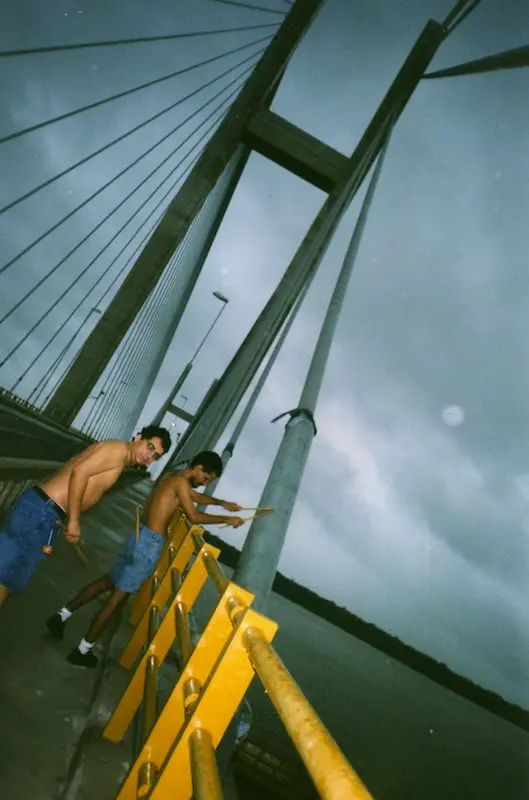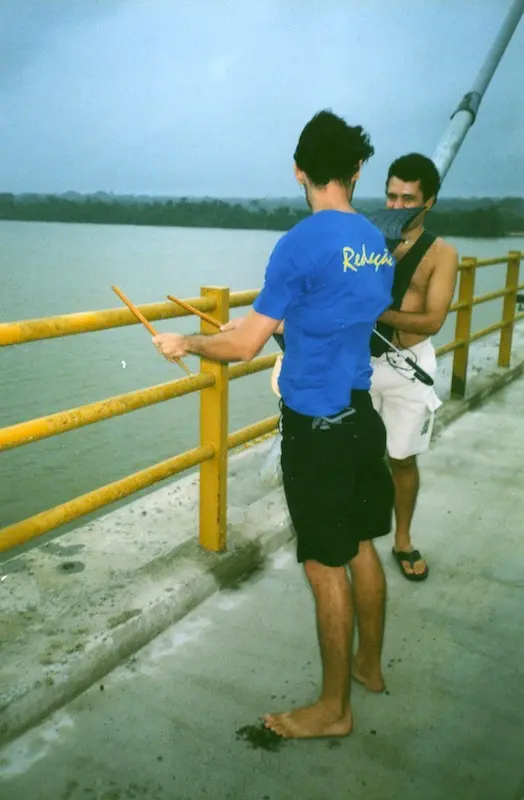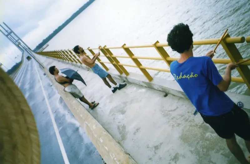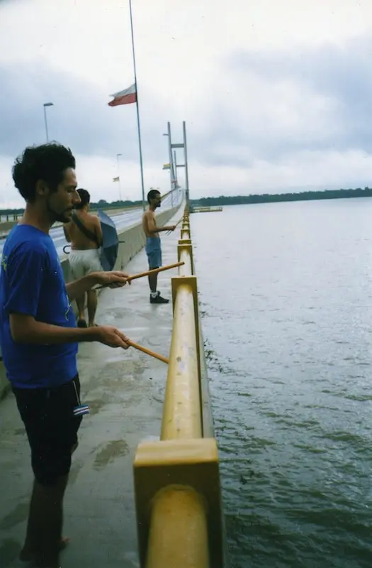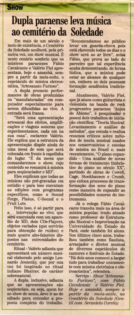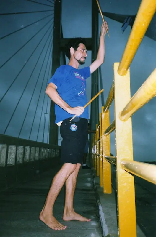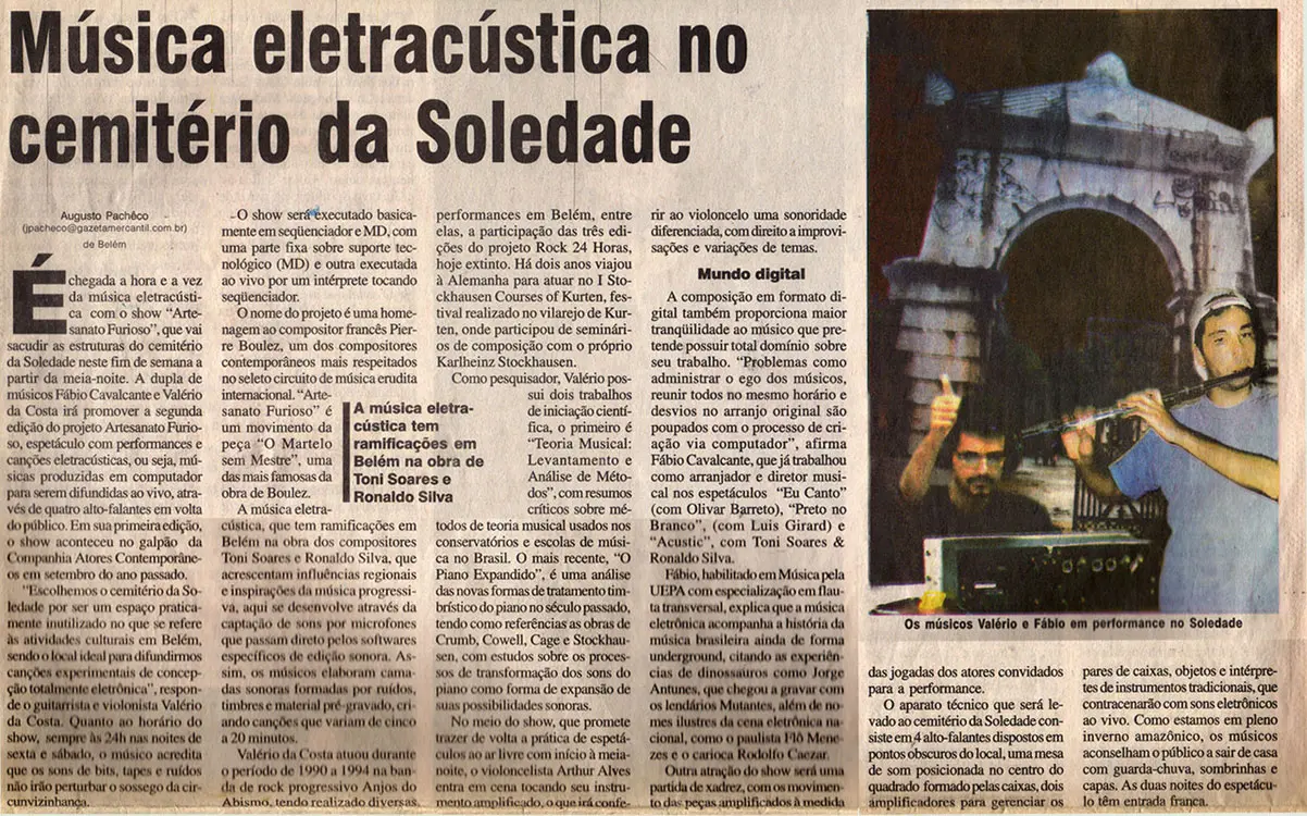 Na tarde de 1° de fevereiro de 2003, tocamos “Músicas congeladas”, do Valério, na ponte sobre o Rio Guamá, da alça viária do Pará. Participaram Allan Carvalho e Cláudio Costa. Os dois e o Valério tocavam a ponte, e eu gravei a execução. É o áudio a seguir.