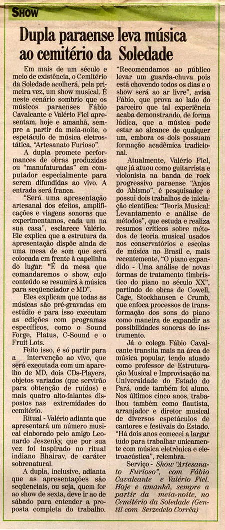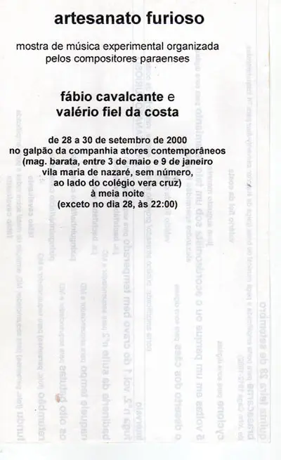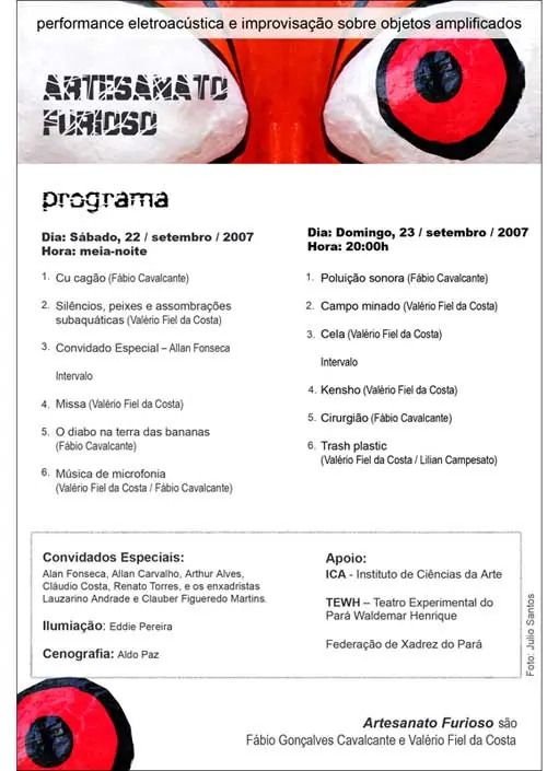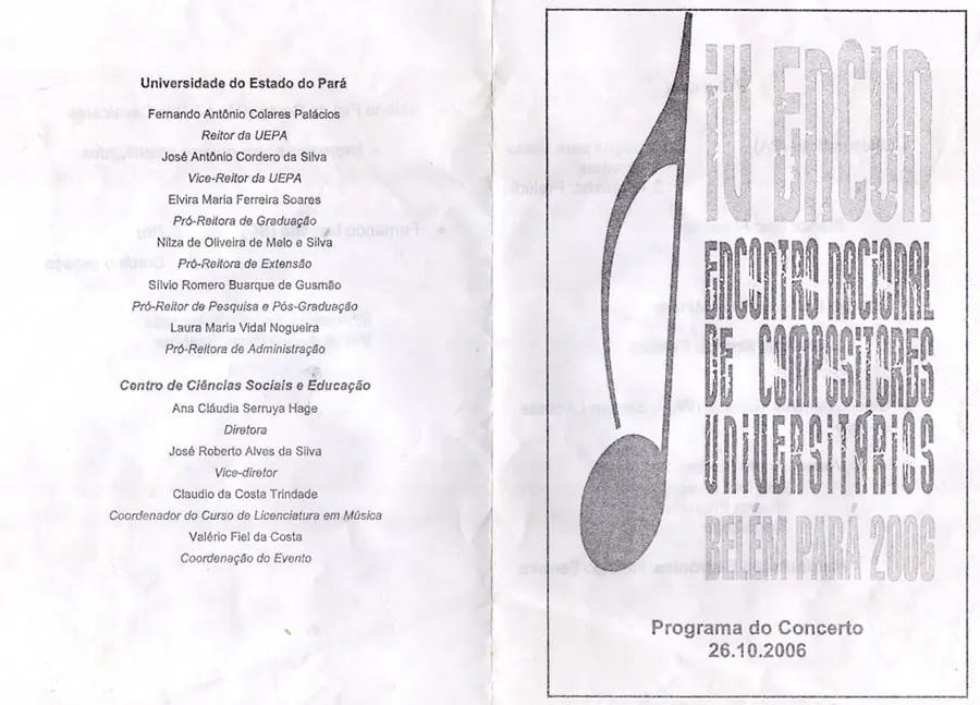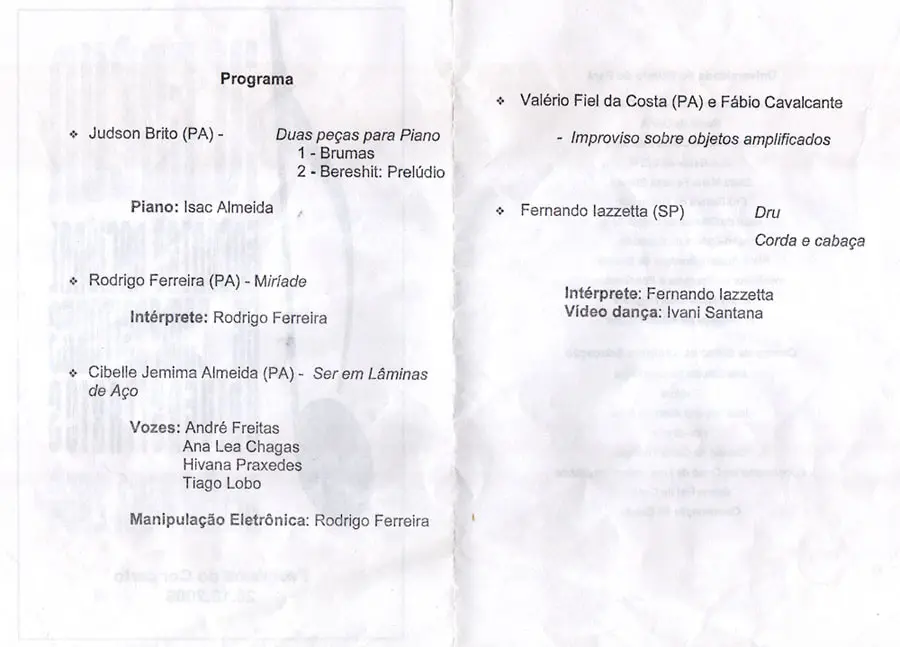 No dia 26 de outubro de 2006, fizemos uma apresentação no IV Encontro Nacional de Compositores Universitários, no Instituto de Ciências da Arte (ICA), em Belém, tocando “Improviso sobre objetos amplificados”, minha e do Valério.